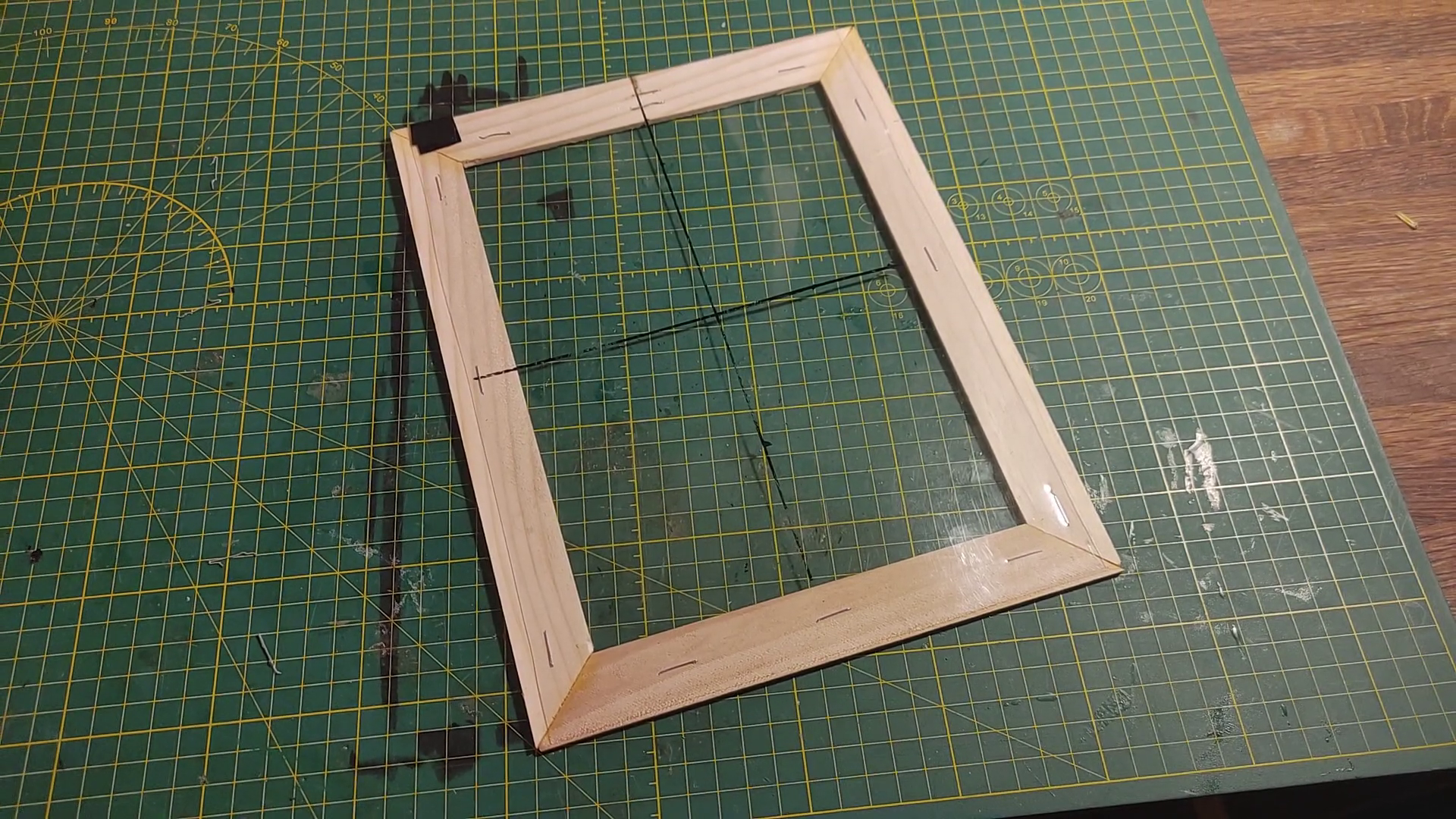 First, the picture plane. This is a tool to assist in transferring a view of the 3D world onto a 2D piece of paper. In the instructions towards the beginning of the book, Edwards writes that this can be made with a thin sheet of transparent plastic or glass with the sharp edges taped off. Originally I opted for the thin plastic but what I found was that it was a little too floppy to be useful. I solved this issue by taking a few paint stirring sticks cut at 45 degree miters, gluing them together, and stapling the sheet to the frame. That has made the plane much more rigid so it can be balanced on the hand, as is required later on.