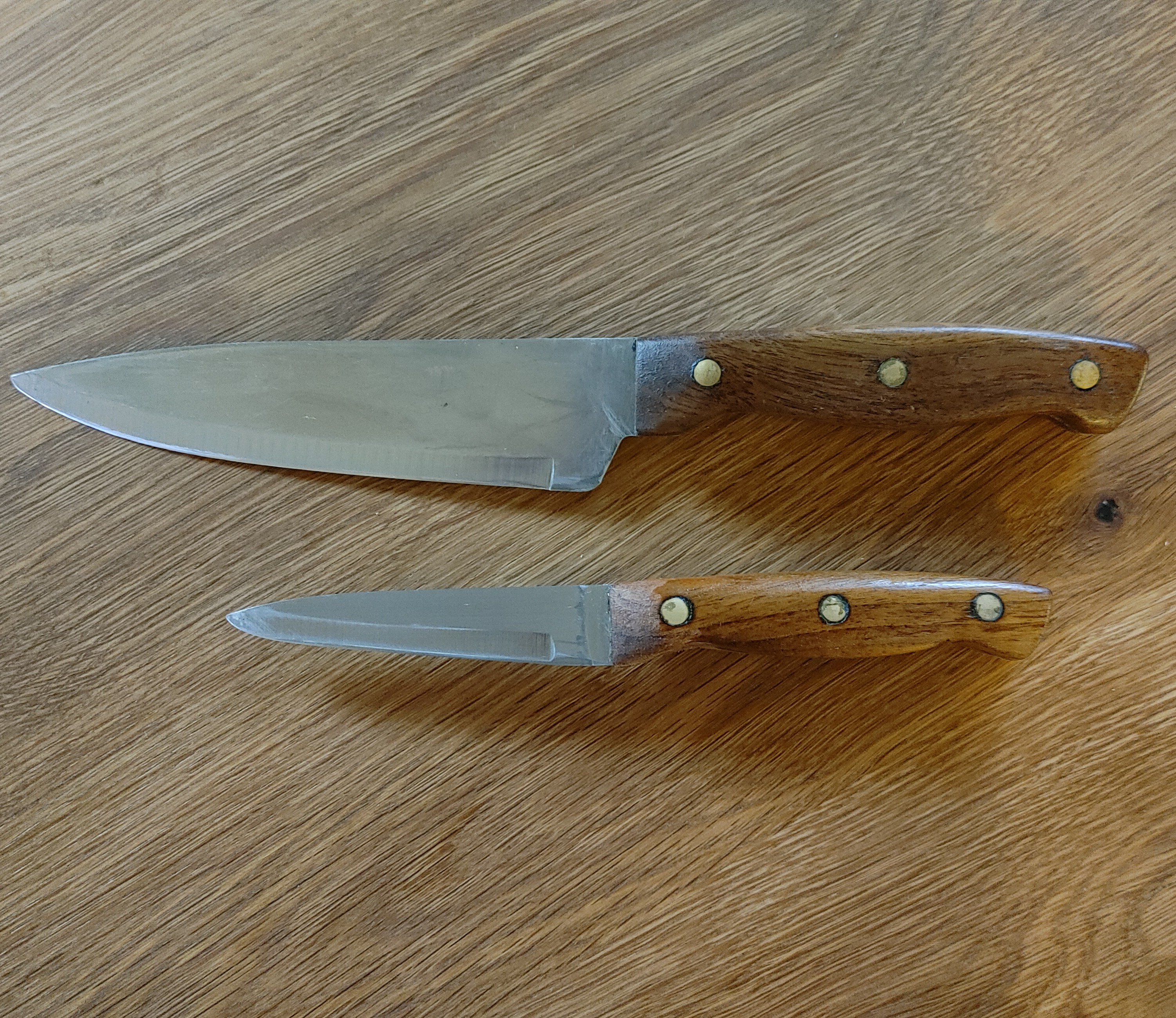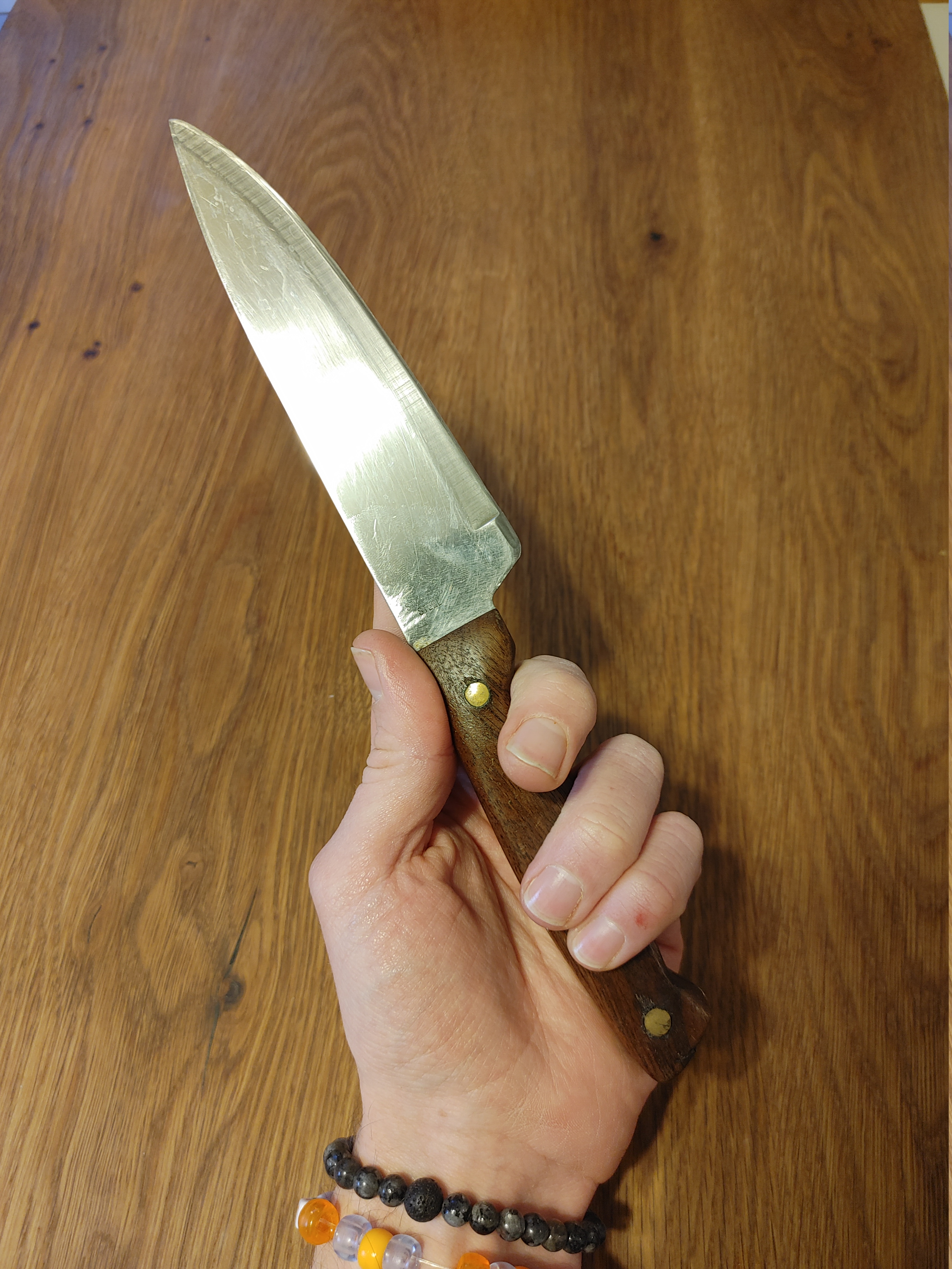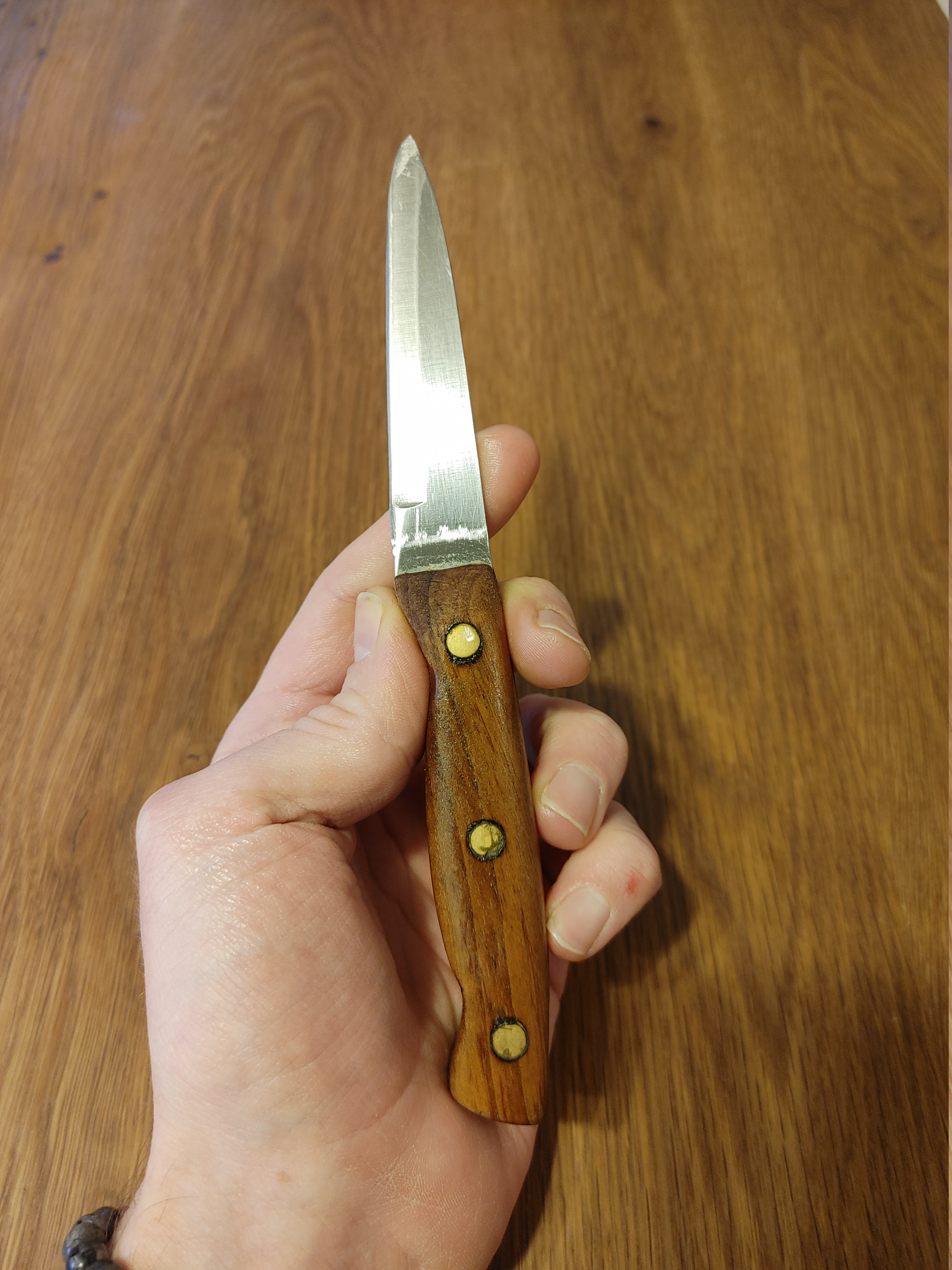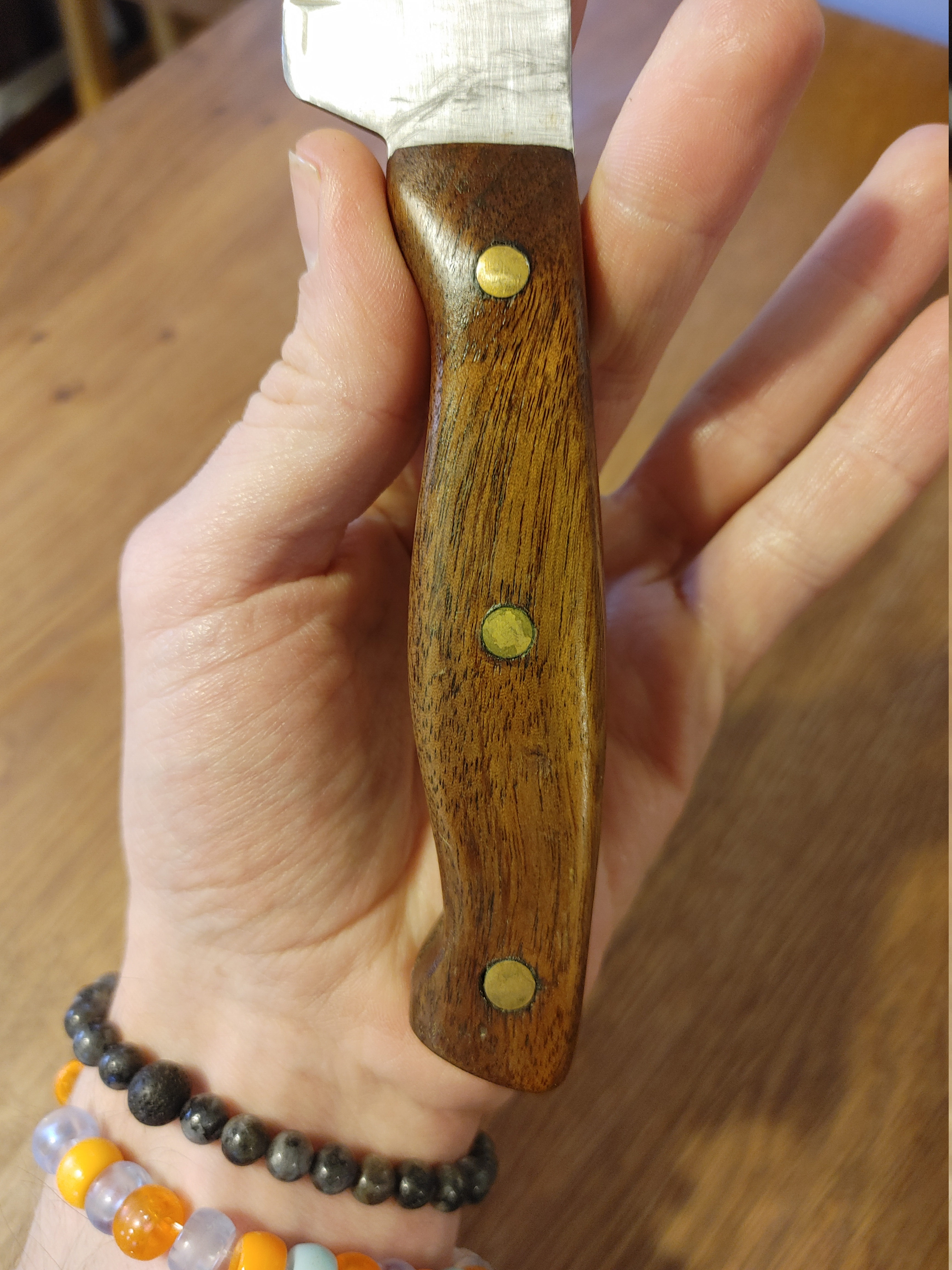 These knives started life as a modest set that one might get from a big box store. They had black plastic handles, and were decently sharp. I decided to remove the handles and attach custom one made from black walnut. The pairing knife was the first one I tried. Getting through the rivets was a struggle, and I burned through two colbalt bits before I got though them. Before I did any handle work, I posished the blade and sharpened it as much as my skill could allow. To make the handle, I rough cut the walnut piece to a bit over the final dimensions. Using a oscilating cutting tool, I cut a course version of the profile. Detailed tight corners called for a coping saw. A scroll saw is probably the better tool for this, but it wasnt so bad. At this point, it was time to attach the pins. I decided on a small diameter brass rod for the task. However, the holes in the blade had to be widened for the rods, so even more drilling! Eventually, I managed to squeeze everything together, to the point that I barely needed glue. Finally, I got to the point of shaping it. A combination of a orbital sander and hand sanding slowly revealed the shape underneath. The nice thing about making your own handle is that you can shape it exactly as you like, if you take your time with it. In the pictures below you'll see that there is a different tone to the wood around the bolster where I recently sanded away more material to shape it a little nicer. And then finally, to seal it and make it resistant to all the work it needs to do, I applied a bit of mineral oil and bee's wax. This is what gives it the incredible warm color in the wood too. The process was largely the same for the chef knife, but things went a bit easier with the practice under my belt. The only change was that I tried to file away the heel to extend the blade all the way back, which is my prefered.